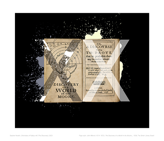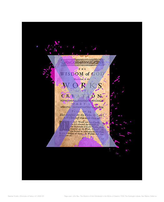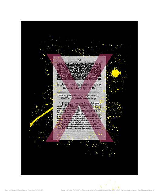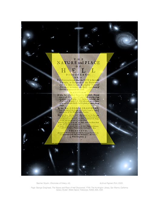 is a limited edition print series-in-progress. It consists of painterly or pictorial disturbances imposed on scanned pages from historical books — X’d out falsehoods that were expounded upon in detail and declared as the truths of their time. Fascinating pages exposing a human inclination to submit to fictional narratives, they represent wavering steps along history’s quest for knowledge. Some fallacies have been put to rest, rectified by fact over fiction while others, updated from their past incarnations, are living still in culturally normalized forms of untrue beliefs. The series is meant to examine the broad presence of fallacy intertwined with history’s ongoing search for truth.